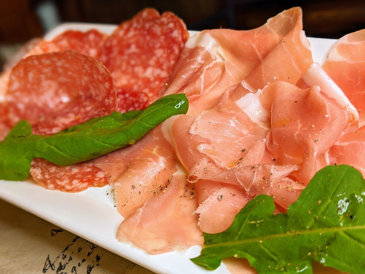 旬の彩り野菜に生ハムとルッコラをトッピング。野菜の旨みをベースにしたほどよい酸味のドレッシングと粉チーズとブラックペッパーで仕上げました!